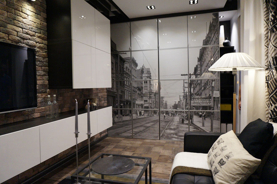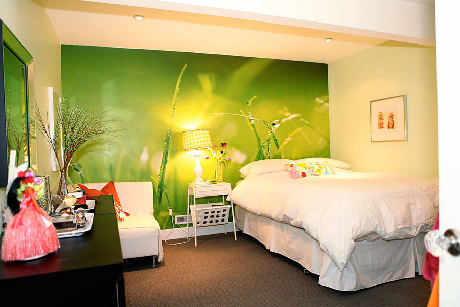 - Одну из стен можно задрапировать в монохромный принт с изображением лесного или городского панорамного пейзажа. Как вариант – фотография любимого вами города с высоты птичьего полета.