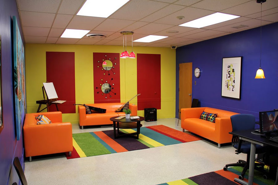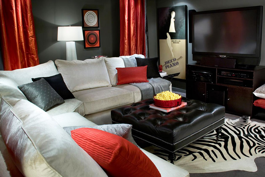 Если комната без окон предназначена для гостиной (иногда в ней устраивают дополнительную гостиную для друзей подростка), добиться яркого центрального освещения можно, сконструировав в центре обильно подсвеченную барную стойку.